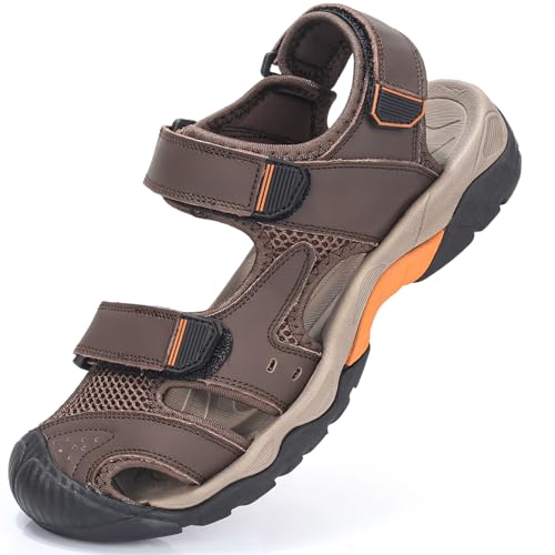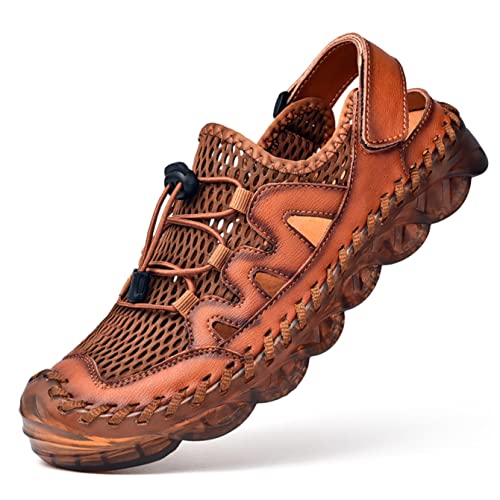 Qiucdzi Mens Closed Toe Sandals, Sport Sandals Casual Leather Handmade Sandals Adjustable Fisherman Beach Sandals For Outdoor Walking Driving,Brown